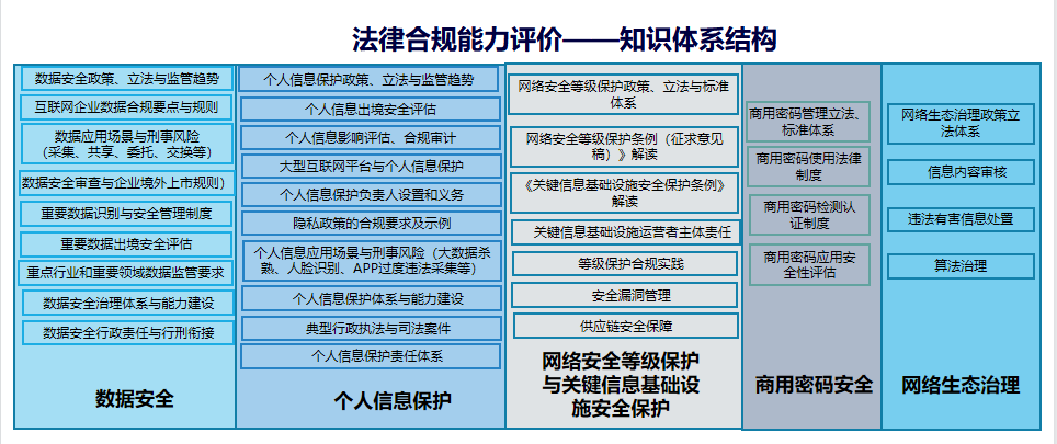 评价培训内容:数据安全、个人信息保护、网络安全等级保护与关键信息基础设施安全保护、商用密码安全和网络生态治理等。